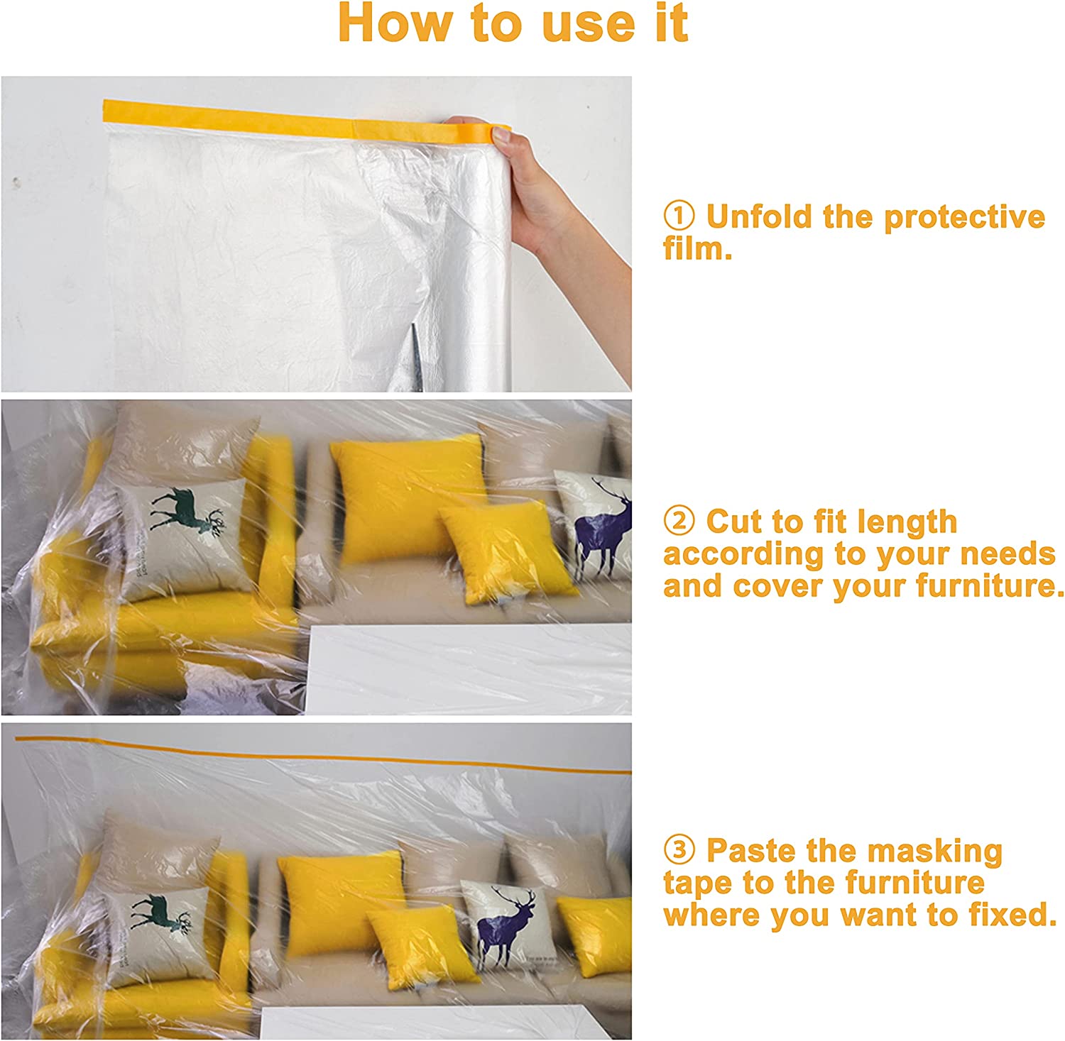 - 【With Positioning Masking Tape】Adhesive masking tape on the top of our plastic sheet(the yellow part) helps you locate the plastic cover.No worry about the plastic tarp falling off or moving.Suitable for three-dimensional furniture such as wardrobe,fridge.